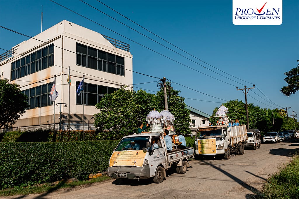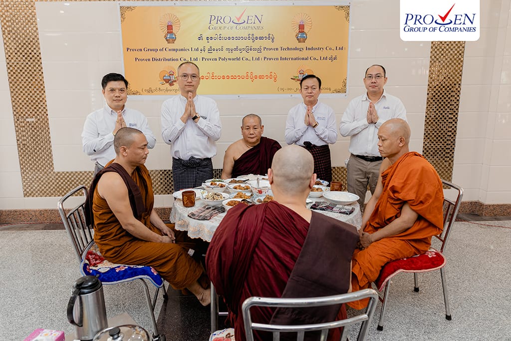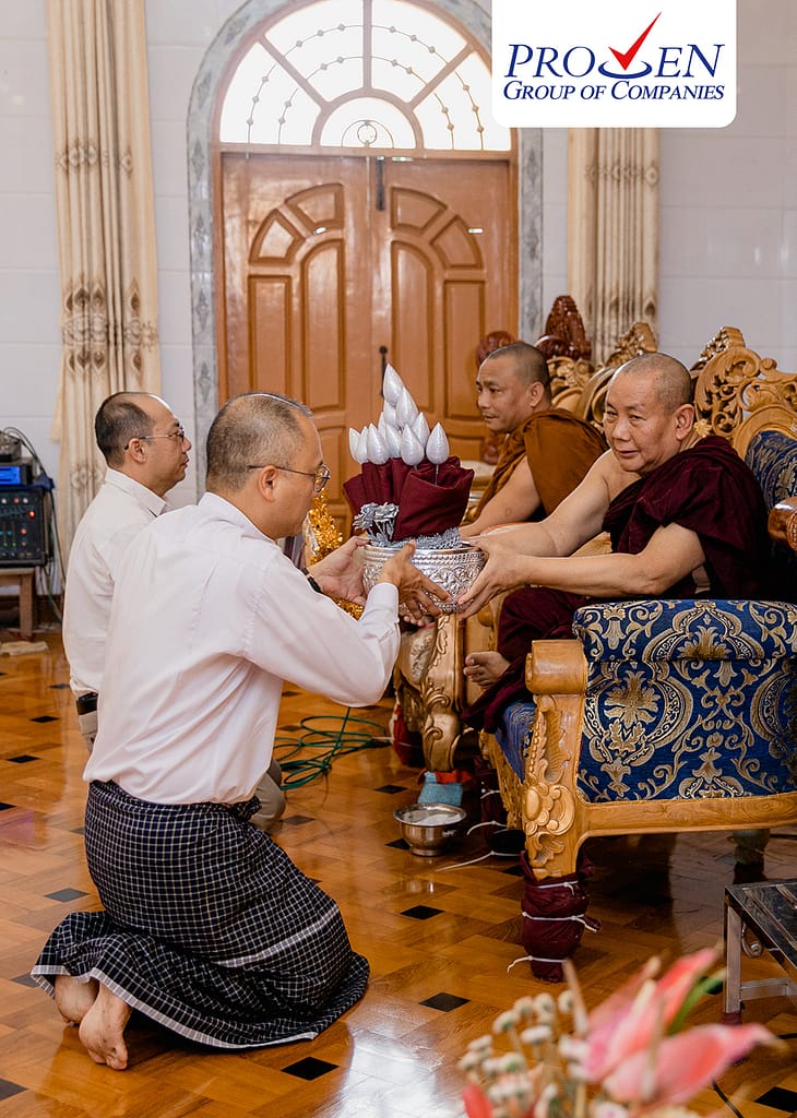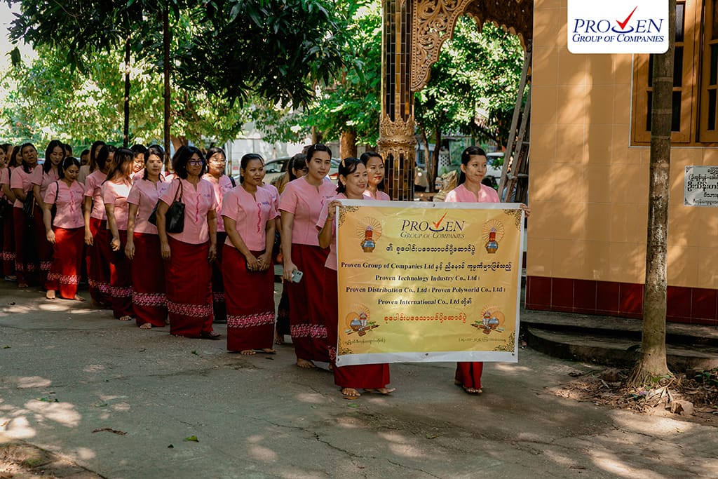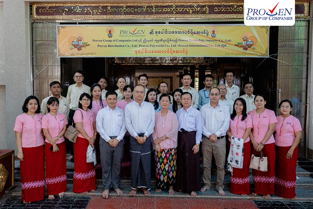 Proven Group of Companies Ltd. နှင့် ညီနောင်ကုမ္ပဏီများဖြစ်သည့် Proven Technology Industry Co., Ltd ၊ Proven Distribution Co., Ltd ၊ Proven Polyworld Co., Ltd၊ Proven International Co., Ltd တို့၏ စုပေါင်းပဒေသာပင်ပို့ဆောင်ပွဲကို ၂၀၂၄ ခုနှစ်၊ နိုဝင်ဘာလ (၁၄) ရက် ( ကြာသပတေး) နေ့တွင် ရန်ကုန်တိုင်းဒေသကြီး၊ ရွှေပြည်သာမြို့နယ်၊ အမှတ်(၄)လမ်းမကြီး၊ (၂၄)ရပ်ကွက် (ဇီးကုန်းကျေးရွာအုပ်စု)အတွင်းတည်ရှိသော ရွှေမြို့ဝင် ဇီးကုန်းကျောင်းတိုက်၌ ဝါတွင်းသုံးလ ကာလပတ်လုံး ဝါကျိုး၊ ဝါပျက်မရှိဘဲ သီတင်းသုံးတော်မူသော သံဃာတော်များအား ကထိန်လျာသင်္ကန်း၊ ငွေပဒေသာပင်နှင့် လှူဖွယ်ပစ္စည်းများရေစက်သွန်းချလှူဒါန်းခဲ့ပါသည်။ ကြွရောက်ပေးကြပါသော Customer များ၊ Supplier များ၊ Proven Group ၏ ဒါရိုက်တာအဖွဲ့ဝင်လူကြီးမင်းများနှင့် ညီနောင်ကုမ္ပဏီမှ ဝန်ထမ်းညီအစ်ကိုမောင်နှမများ အားလုံးကို ကျေးဇူးအထူးပင်တင်ရှိပါသည်။