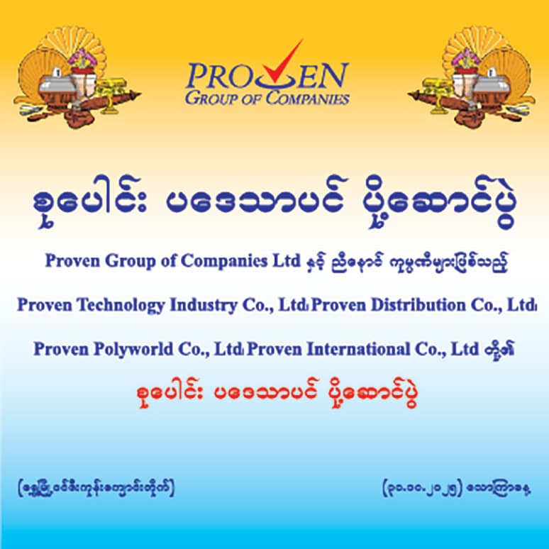 Proven Group of Companies Ltd. နှင့် ညီနောင်ကုမ္ပဏီများဖြစ်သည့် Proven Technology Industry Co., Ltd ၊ Proven Distribution Co., Ltd ၊ Proven Polyworld Co., Ltd၊ Proven International Co., Ltd တို့၏ စုပေါင်းပဒေသာပင်ပို့ဆောင်ပွဲကို ၂၀၂၅ ခုနှစ်၊ အောက်တိုဘာလ (၃၁) ရက် ( သောကြာနေ့) နေ့တွင် ရန်ကုန်တိုင်းဒေသကြီး၊ ရွှေပြည်သာမြို့နယ်၊ အမှတ်(၄)လမ်းမကြီး၊ (၂၄)ရပ်ကွက် (ဇီးကုန်းကျေးရွာအုပ်စု)အတွင်းတည်ရှိသော ရွှေမြို့ဝင် ဇီးကုန်းကျောင်းတိုက်၌ ဝါတွင်းသုံးလ ကာလပတ်လုံး ဝါကျိုး၊ ဝါပျက်မရှိဘဲ သီတင်းသုံးတော်မူသော သံဃာတော်များအား ကထိန်လျာသင်္ကန်း၊ ငွေပဒေသာပင်နှင့် လှူဖွယ်ပစ္စည်းများရေစက်သွန်းချလှူဒါန်းခဲ့ပါသည်။ ကြွရောက်ပေးကြပါသော Customer များ၊ Supplier များ၊ Proven Group ၏ ဒါရိုက်တာအဖွဲ့ဝင်လူကြီးမင်းများနှင့် ညီနောင်ကုမ္ပဏီမှ ဝန်ထမ်းညီအစ်ကိုမောင်နှမများ အားလုံးကို ကျေးဇူးအထူးပင်တင်ရှိပါသည်။